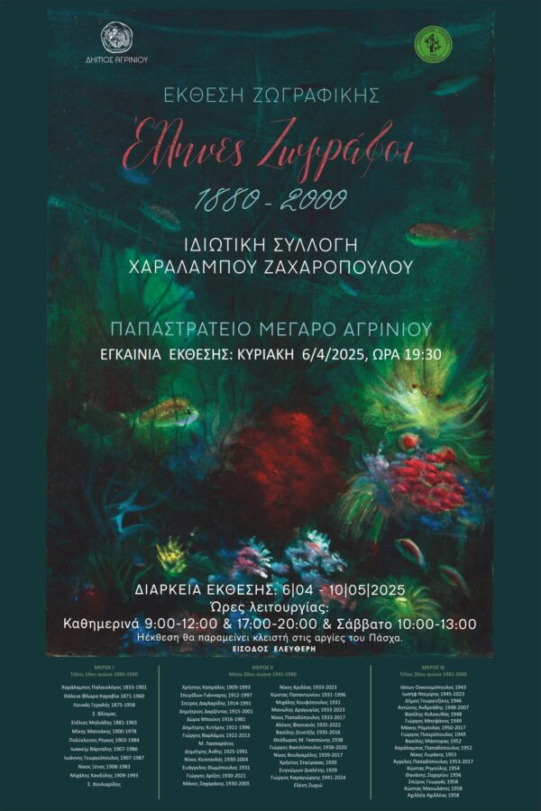 Ο Δήμος Αγρινίου και η Γυμναστική Εταιρεία Αγρινίου συνδιοργανώνουν την «Έλληνες Ζωγράφοι 1880-2000» της ιδιωτικής συλλογής του Ζωγράφου και Συλλέκτη Χαράλαμπου Ζαχαρόπουλου την Κυριακή 6 Απριλίου 2025 στις 20:00 στο Παπαστράτειο Μέγαρο Αγρινίου.
