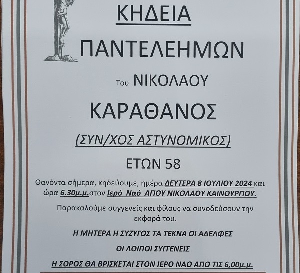 Έφυγε αιφνίδια από την ζωή ο Παντελής Καραθάνος , μόλις 58 ετών , συνταξιούχος αστυνομικό που για πολλά χρόνια υπηρέτησε στο Θέρμο