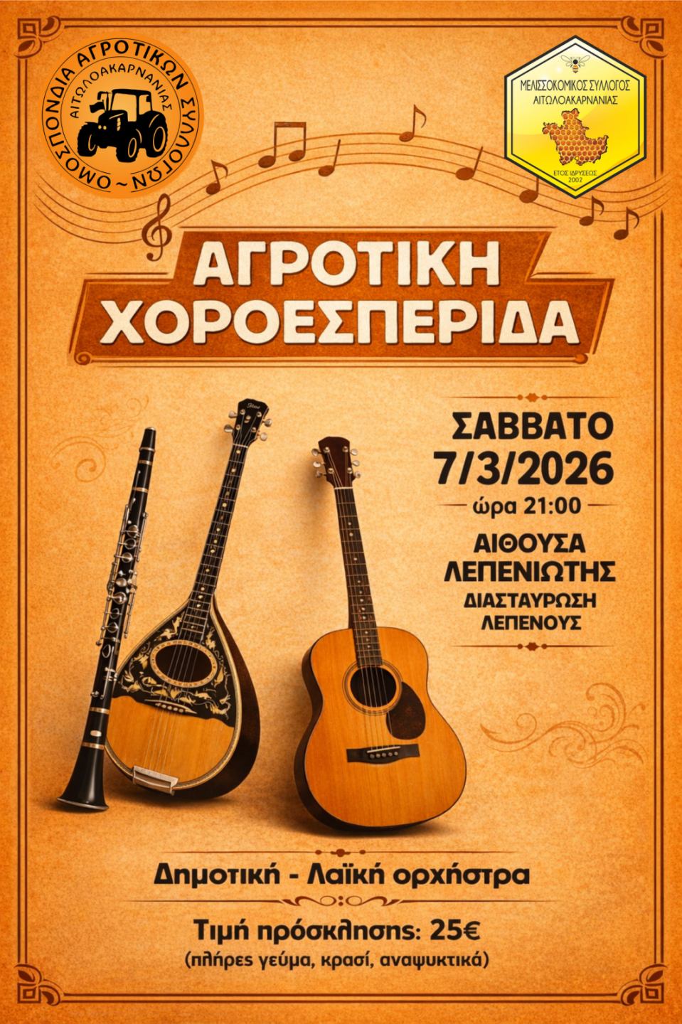 Η Ομοσπονδία Αγροτικών Συλλόγων Αιτωλοακαρνανίας και ο Μελισσοκομικός Σύλλογος Νομού Αιτωλοακαρνανίας διοργανώνουν αγροτική χοροεσπερίδα το Σάββατο 7 Μάρτη, στην αίθουσα «Λεπενιώτη» (διασταύρωση Λεπενούς), στις 21:00, με δημοτική-λαϊκή ορχήστρα.