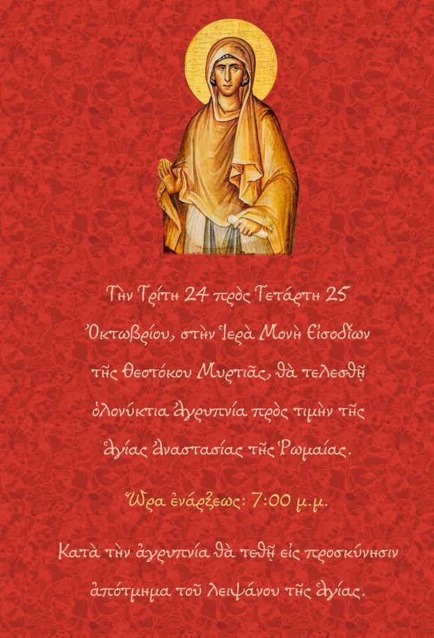 Την Τρίτη 24 Οκτωβρίου και ώρα 7:00μμ θα τελεστεί Ιερά Αγρυπνία στην Ιερά Μόνη Εισοδίων Θεοτόκου Μυρτιάς Τριχωνίδος επι τη εορτή της Αγίας Αναστασίας της Ρωμαίας.