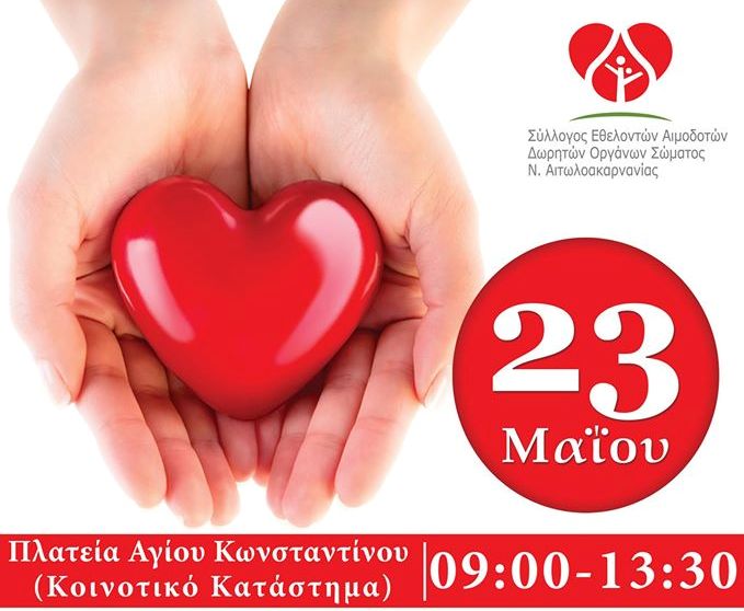 Ο ΣΕΑΔΟΣ ΑΙΤΩΛΝΙΑΣ σε συνεργασία με τον σύλλογο ποντίων ΔΗΜΗΤΗΣ ΨΑΘΑΣ , τον σύλλογο Μικρασιατων ,τον σύλλογο Πραμαντιωτων, τον σύλλογο Α.με.α ΑΠΟΣΤΟΛΟΣ ΛΟΥΚΑΣ ,τον αθλητικό σύλλογο ΠΑΣ ΙΩΝΙΚΟ ,την ΑΕΚ Άγιου Κωνσταντίνου και την ένωση παλαιμάχων ποδοσφαιριστών σας καλούν στην εθελοντική αιμοδοσία που θα γίνει αύριο ημέρα Σάββατο 23 Μαρτίου στην πλατεία του Αγιου Κωνσταντινου από τις 09:00 το πρωι μεχρι 13:30 το μεσημέρι.