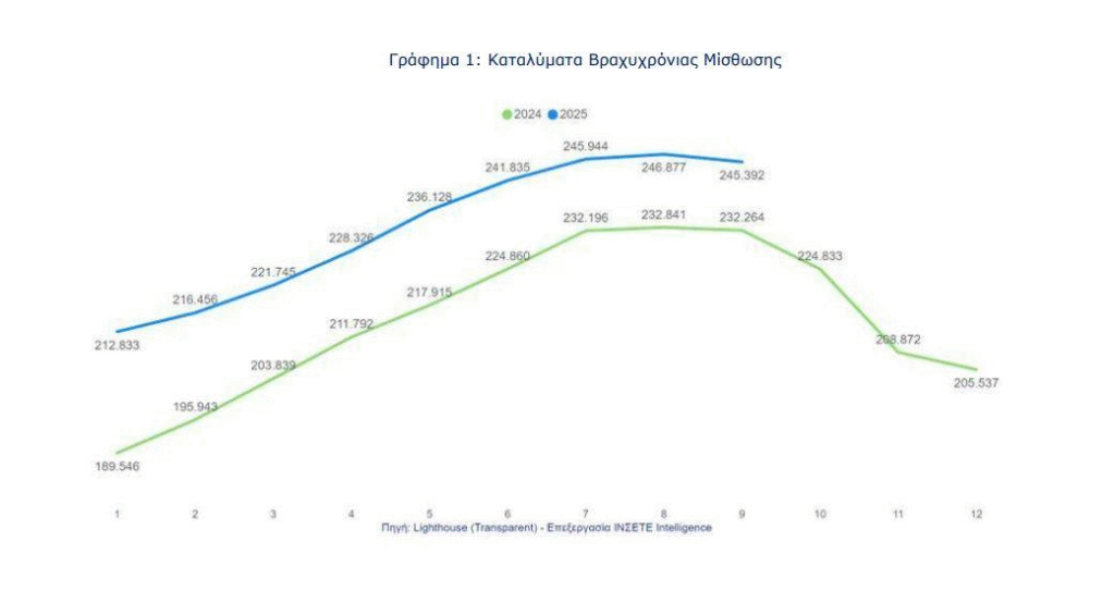 Το Γ’ τρίμηνο συνέχισε επίσης με θετικό ρυθμό. Τον Ιούλιο τα διαθέσιμα καταλύματα ανήλθαν σε 246 χιλ., υπερβαίνοντας τα 232 χιλ. του Ιουλίου 2024 (+14 χιλ.), ενώ τον Αύγουστο σημειώθηκε νέο ιστορικό υψηλό με 247 χιλ., αυξημένα κατά +14 χιλ. έναντι των 233 χιλ. του Αυγούστου 2024. Τον Σεπτέμβριο παρατηρείται οριακή αποκλιμάκωση στα 245 χιλ. καταλύματα, παραμένοντας ωστόσο +13 χιλ. υψηλότερα σε σχέση με τα 232 χιλ. του Σεπτεμβρίου 2024.