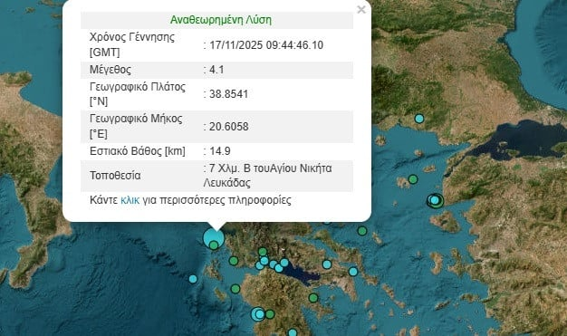 Ισχυρός σεισμός τώρα σημειώθηκε στη Λευκάδα πριν από λίγα λεπτά, μεγέθους 4,1 ρίχτερ.