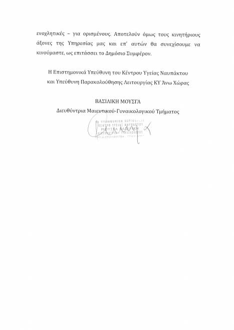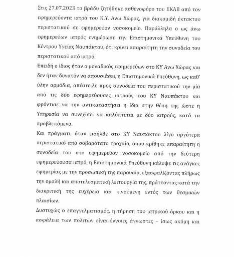 Σας αναφέρω, συνεχίζει, ότι 23:00 περίπου όπως ενημερώθηκα μετέβη στο Κ.Υ. Ναυπάκτου η επ. υπεύθυνη Βασιλική Μουσγά Γυναικολόγος δίχως να έχει υπηρεσία και εφημερία και έδωσε εντολή στον εφημερεύοντα γιατρό να συνοδεύσει το ασθενοφόρο του ΕΚΑΒ μαζί με το πλήρωμα για να παραλάβει το περιστατικό από το Κ.Υ. Άνω Χώρας και να μεταφέρει, στο Νοσοκομείο Άγιο Ανδρέα Πατρών.