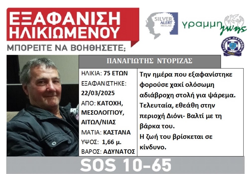 Ο Παναγιώτης Ντόριζας, 75 ετών, εξαφανίστηκε από το σπίτι του, στην Κατοχή Μεσολογγίου, Αιτωλοακαρνανίας, το απόγευμα της 22/03/25, όταν έφυγε για να μεταβεί για ψάρεμα στην περιοχή Διόνι- Βαλτί στην νήσο Πεταλά Εχινάδων, με τη βάρκα του.