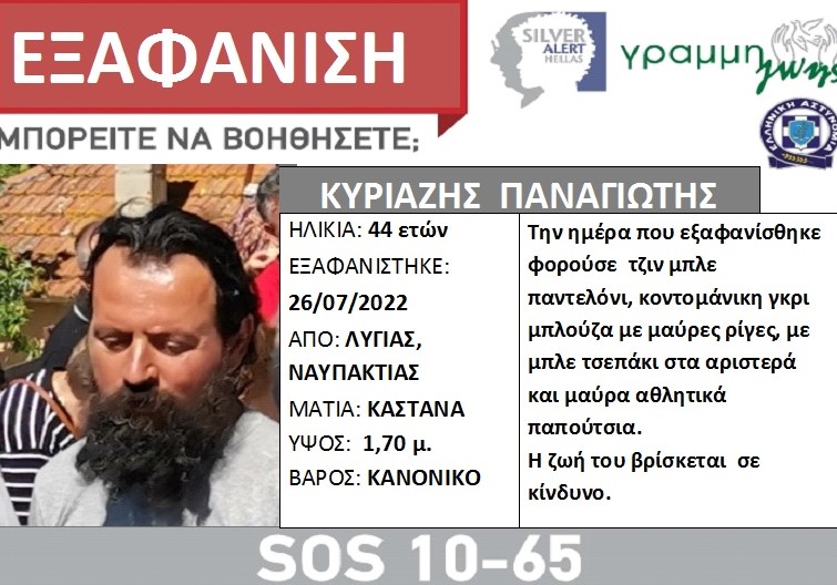 Ο Παναγιώτης Κυριαζής, 44 ετών, εξαφανίστηκε από το σπίτι του, στο χωριό Λυγιάς, Ναυπακτίας, το απόγευμα της 26/07/2022, όταν αναχώρησε με τα πόδια για με κατεύθυνση το χωριό Σκάλα Ναυπακτίας, πιθανότατα μέσω του μονοπατιού «Παναγία». Έκτοτε, δεν έχει δώσει σημεία ζωής.