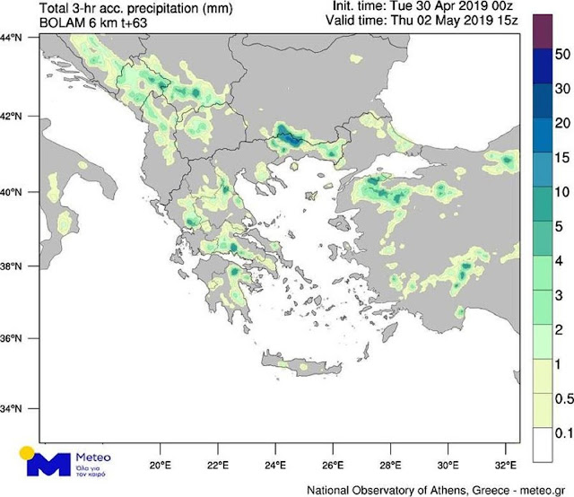 Σύμφωνα πάντα με τα προγνωστικά στοιχεία την Πέμπτη 2 Μαΐου, όπως φαίνεται και στον προγνωστικό χάρτη παρακάτω, αναμένεται άστατος καιρός με βροχές και σποραδικές καταιγίδες τις θερμές ώρες της ημέρας σε αρκετές περιοχές του ηπειρωτικού κορμού της χώρας, και ιδιαίτερα στα ορεινά.