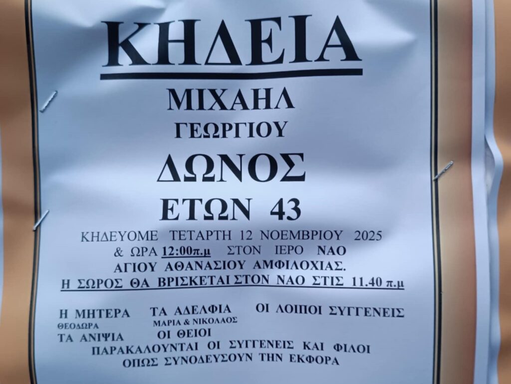 Tην Τετάρτη 12 Νοεμβρίου 2025 συγγενείς , φίλοι και συνάδελφοι θα πουν το τελευταίο αντίο στον 43χρονο Μιχαήλ Δώνο, υπάλληλο του Δήμου Αμφιλοχίας. Η εξόδιος ακολουθία θα τελεσθεί στον Ι.Ν. Αγίου Αθανασίου Αμφιλοχίας στις 12μμ ενώ η σορός θα βρίσκεται στο ναό από τις 11:40 π.μ.