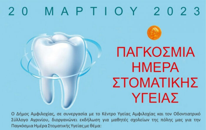 Ο Δήμος Αμφιλοχίας, σε συνεργασία με το Κέντρο Υγείας Αμφιλοχίας και τον Οδοντιατρικό Σύλλογο Αγρινίου, διοργανώνει εκδήλωση για την Παγκόσμια Ημέρα Στοματικής Υγείας με θέμα «Πρόληψη – Διατροφή – Αγωγή Υγείας», τη Δευτέρα 20 Μαρτίου 2023 στην αίθουσα πολλαπλών χρήσεων του Δήμου Αμφιλοχίας (Ημιώροφος Δημαρχείου).