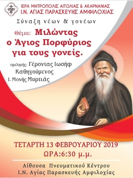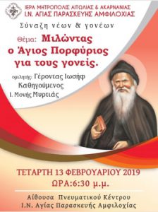 Αμφιλοχία: Ομιλία με θέμα “Μιλώντας ο Άγιος Πορφύριος με τους γονείς”