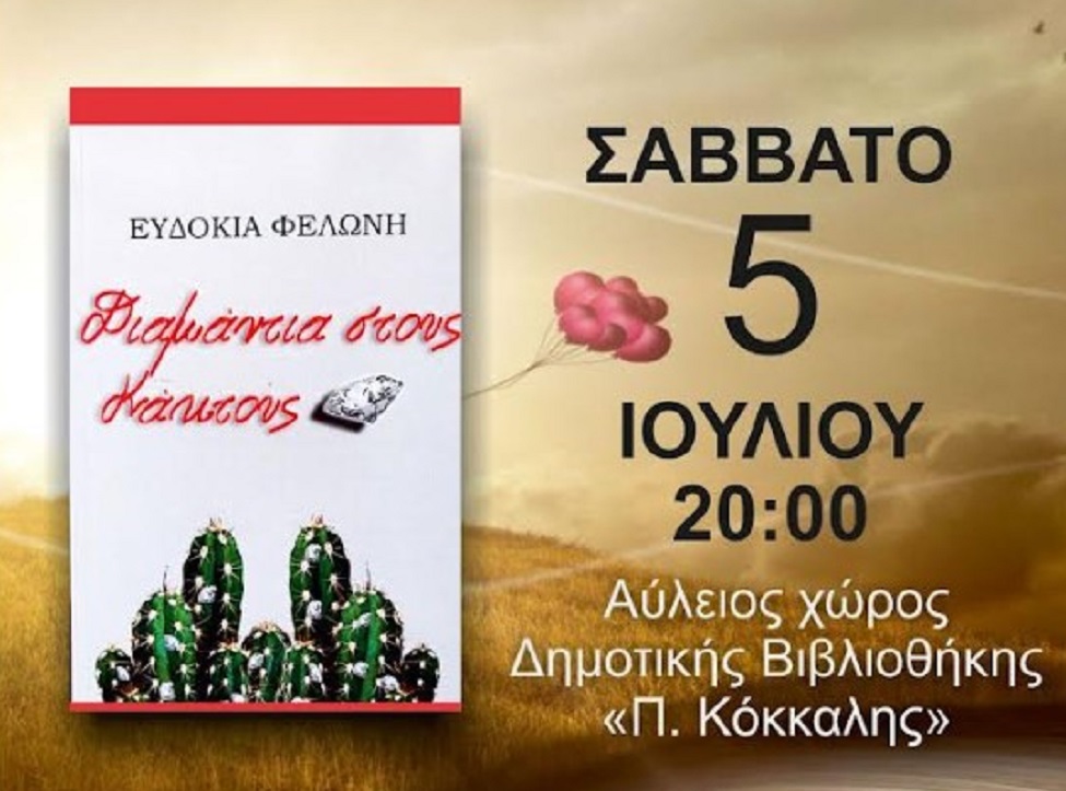 Παρουσίαση του βιβλίου της συγγραφέως Ευδοκίας Φελώνη «Διαμάντια στους κάκτους» διοργανώνει το Σάββατο 5 Ιουλίου στις 20:00 μ.μ. ο Δήμος Αμφιλοχίας και η Δημοτική Βιβλιοθήκη “Π. Κόκκαλης” στον αύλειο χώρο της βιβλιοθήκης στην Αμφιλοχία.