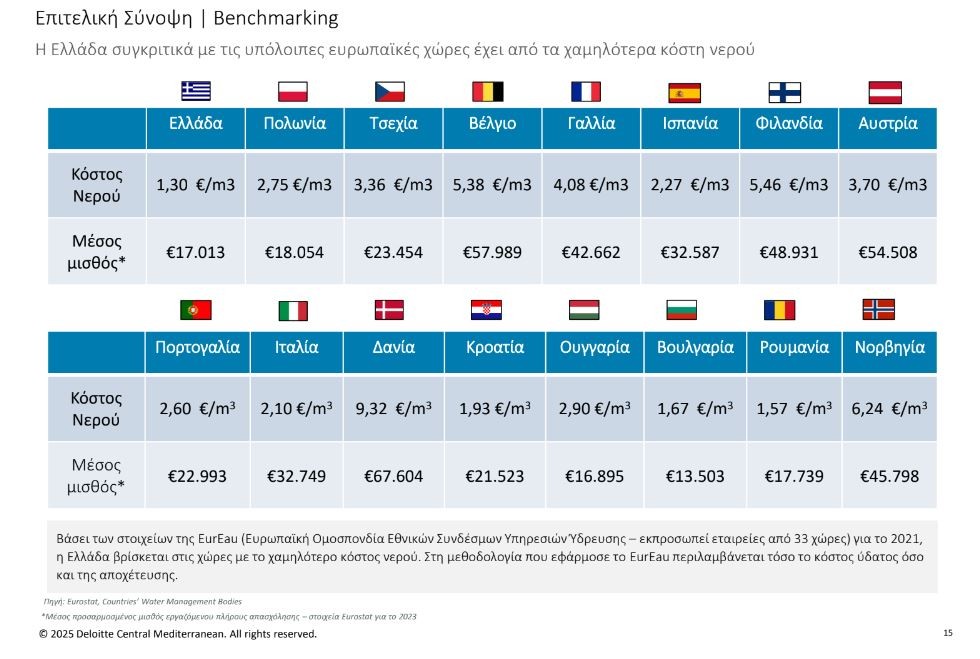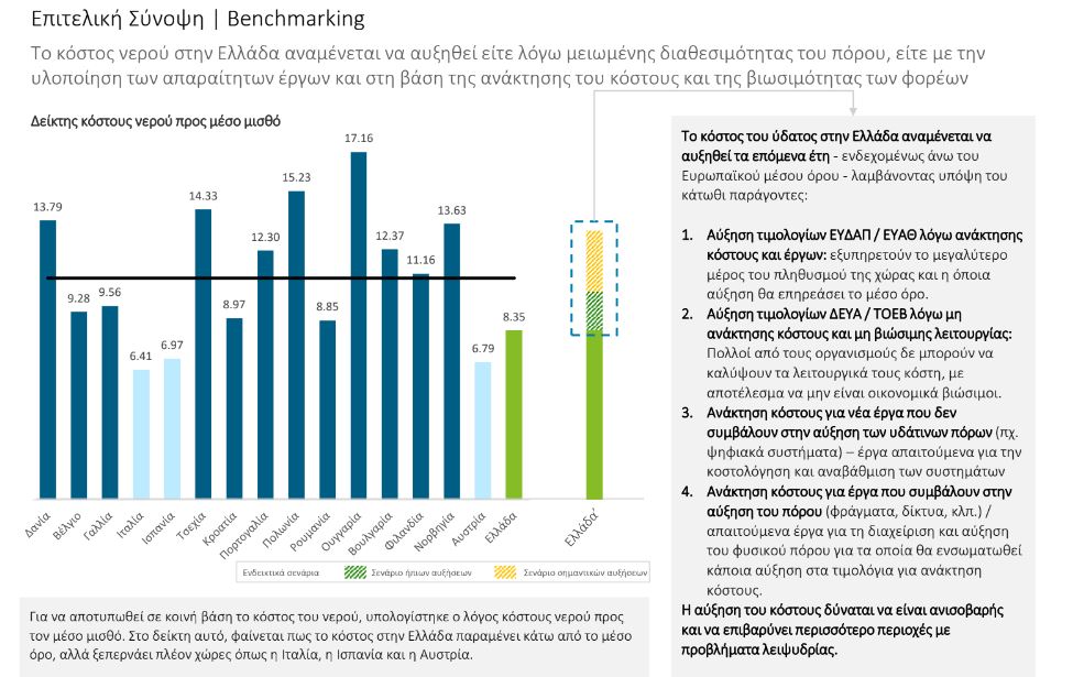 Η σύγκριση με άλλες ευρωπαϊκές χώρες, όπως η Ιρλανδία, η Πολωνία και η Τσεχία, ενισχύει την ανάγκη συγκεντρωτικών μοντέλων διαχείρισης και συνεργασιών μεταξύ φορέων. Παρότι η Ελλάδα συγκαταλέγεται στις χώρες με το χαμηλότερο κόστος νερού, προβλέπεται σταδιακή αύξηση, κυρίως λόγω της ανάγκης για έργα, αναβάθμιση των υποδομών και ανάκτηση κόστους λειτουργίας. Για παράδειγμα στην χώρα μας το κόστος νερού ανέρχεται σε 1,30 ευρώ ανά κυβικό με πιο κοντινές αγορές από πλευράς τιμολόγησης την Ρουμανία και την Βουλγαρία όπου το κυβικό διαμορφώνεται σε 1,57 ευρώ και 1,67 ευρώ. Σε άλλες χώρες όπως η Ιταλία είναι στα 2,10 ευρώ, στη Γαλλία 4,08 ευρώ και στην Νορβηγία 6,24 ευρώ. Η συγκέντρωση δραστηριοτήτων σε κεντρικούς φορείς παρατηρείτε και στο εξωτερικό με χαρακτηριστικό παράδειγμα την Irish Water στην Ιρλανδία η οποία διαχειρίζεται όλα τα πάγια, τα έσοδα και τα κόστη για την επίτευξη οικονομιών κλίμακας, αποδοτικότερο κοστολογική βάση και καλύτερη εφαρμογή της εθνικής στρατηγικής.