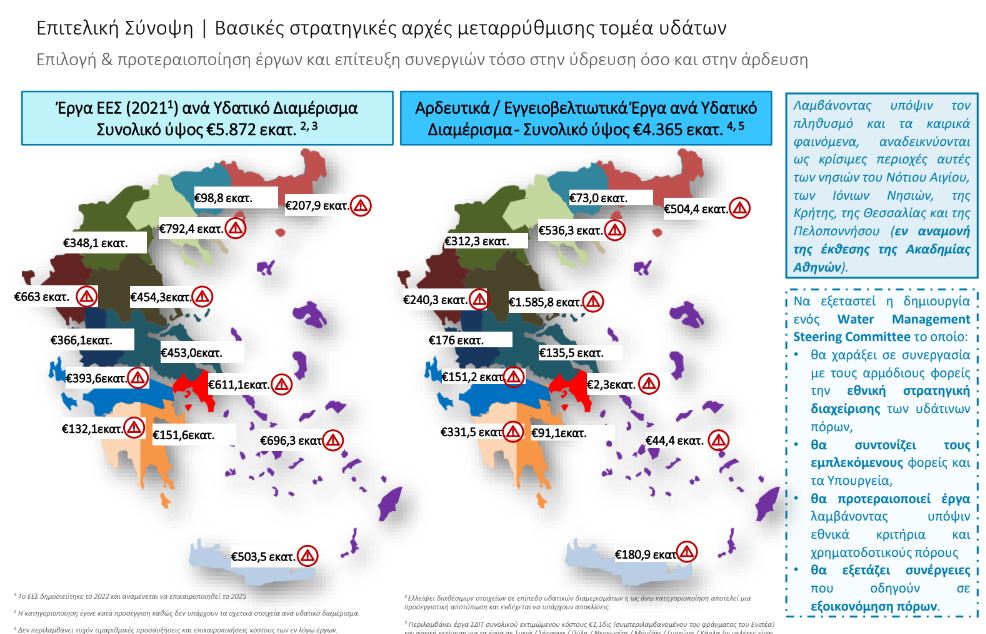Τη βάση για τη διαμόρφωση της νέας εθνικής στρατηγικής για το νερό αποτελεί μελέτη της Deloitte που υλοποιήθηκε για λογαριασμό της κυβέρνησης, Η μελέτη της Deloitte με την κωδική ονομασία Project Aquarium, προβλέπει αύξηση του κόστους (ενδεχομένως και πάνω από τον ευρωπαικό μέσο όρο) λόγω: νέων έργων και επενδύσεων σε φράγματα, υποδομών, αντλιοστασίων και ΚΕΛ -ανάκτησης κόστους λειτουργίας για τους φορείς που σήμερα είναι ελλειμματικοί, αναδιάρθρωσης τιμολογίων σε ΕΥΔΑΠ, ΕΥΑΘ, ΔΕΥΑ και ΤΟΕΒ, αναγκαίων τεχνολογικών επενδύσεων (π.χ. ψηφιακές μετρήσεις, ενεργειακές αναβαθμίσεις). Η αύξηση εκτιμάται ότι θα είναι ανισοβαρής, επηρεάζοντας περισσότερο περιοχές με προβλήματα λειψυδρίας (Νότιο Αιγαίο, Ιόνια, Κρήτη, Θεσσαλία).