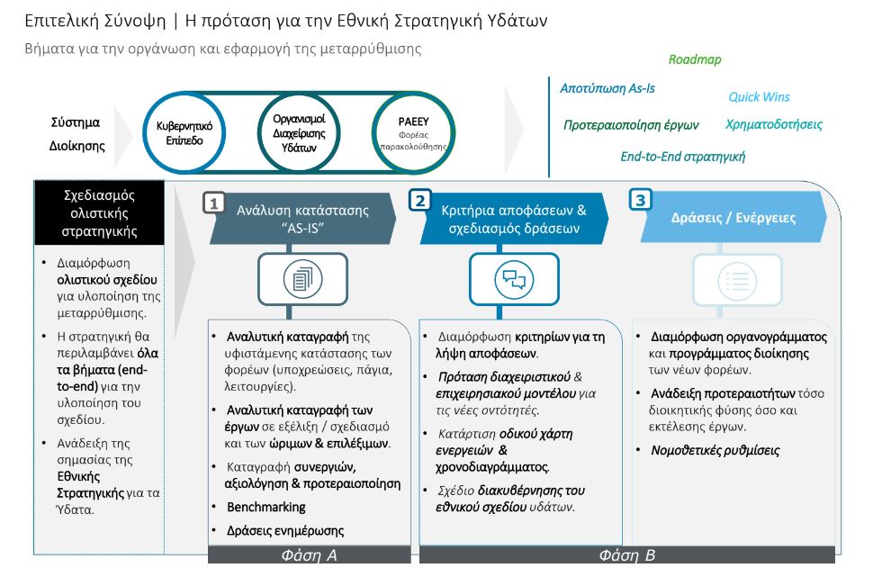 Η στρατηγική που προτείνεται μέσω του Project Αcquarius της Deloitte βασίζεται σε έναν ολιστικό σχεδιασμό, με στόχο την δημιουργία της εθνικής στρατηγικής για τα νερά με σαφή διαχωρισμό αρμοδιοτήτων, αξιολόγηση όλων των υφιστάμενων φορέων και έργων, και την ίδρυση νέων νομικών οντοτήτων (Α.Ε.) ανά λεκάνη απορροής. Οι εταιρείες αυτές, εκτός Γενικής Κυβέρνησης, θα διαθέτουν πάγια περιουσιακά στοιχεία και υποχρεώσεις, θα έχουν πιστοληπτική ικανότητα, και θα είναι σε θέση να αντλούν πόρους από την Ευρωπαϊκή Τράπεζα Επενδύσεων και άλλα χρηματοδοτικά εργαλεία. Ταυτόχρονα, το σχέδιο προβλέπει ενιαίο σύστημα τιμολόγησης ανά χρήση (ύδρευση, άρδευση, βιομηχανία), ψηφιοποίηση των δικτύων ύδρευσης και άρδευσης και ενιαία βάση δεδομένων και μηχανισμό κοστολόγησης του νερού.