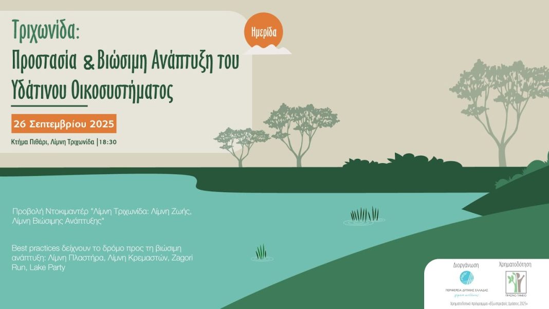 Εκδήλωση με θέμα: “Τριχωνίδα: Προστασία & Βιώσιμη Ανάπτυξη του Υδάτινου Οικοσυστήματος”, διοργανώνει η Περιφέρεια Δυτικής Ελλάδας, την Παρασκευή 26 Σεπτεμβρίου 2025 και ώρα 18.30 στη λίμνη Τριχωνίδα (Κτήμα Πιθάρι), στο πλαίσιο της πρωτοβουλίας “Οικονομική Υποστήριξη Εξωστρεφών Δράσεων 2025” του Πράσινου Ταμείου.