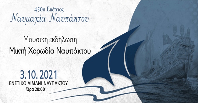 Ανοίγει την Κυριακή, 3 Οκτωβρίου 2021, η αυλαία των Επετειακών Εορτασμών του Δήμου Ναυπακτίας για τη συμπλήρωση των 450 χρόνων από τη Ναυμαχία της Ναυπάκτου, με τη Μουσική Εκδήλωση της Μικτής Χορωδίας Ναυπάκτου που θα πραγματοποιηθεί στο Ενετικό Λιμάνι, ώρα 20:00’.