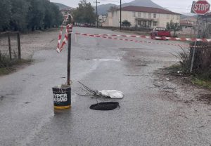Μια βαθιά τρύπα άνοιξε στο οδόστρωμα στην περιοχή της Χαραυγής στο Καινούργιο στον κάθετο δρόμο με τον περιφερειακό και μετά το 2ο Δημοτικό Σχολείο.