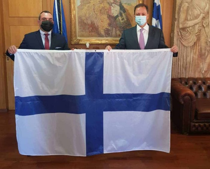 Ο Υπουργός δέχθηκε με χαρά το αντίγραφο της σημαίας, το οποίο, όπως είπε, κατά το Σαββατοκύριακο του επετειακού εορτασμού της Εξόδου του Μεσολογγίου, θα ανεμίζει έξω από το ΥΠΑΑΤ.
