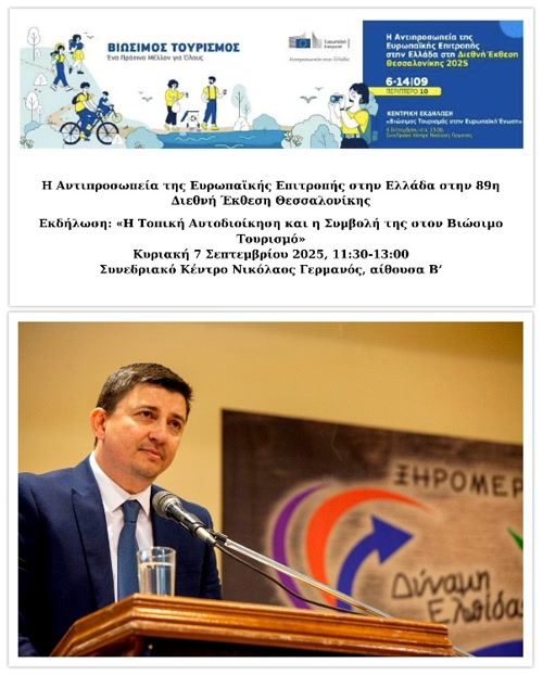 Την Κυριακή 7 Σεπτεμβρίου, η Αντιπροσωπεία της Ευρωπαϊκής Επιτροπής στην Ελλάδα διοργανώνει συζήτηση στρογγυλής τραπέζης με θέμα: «Η Τοπική Αυτοδιοίκηση και η Συμβολή της στον Βιώσιμο Τουρισμό», με ομιλητές εκπροσώπους της Τοπικής Αυτοδιοίκησης Α’ βαθμού και ιδιαίτερα μέλη του Ελληνικού Δικτύου Τοπικών Συμβούλων της Ευρωπαϊκής Ένωσης.