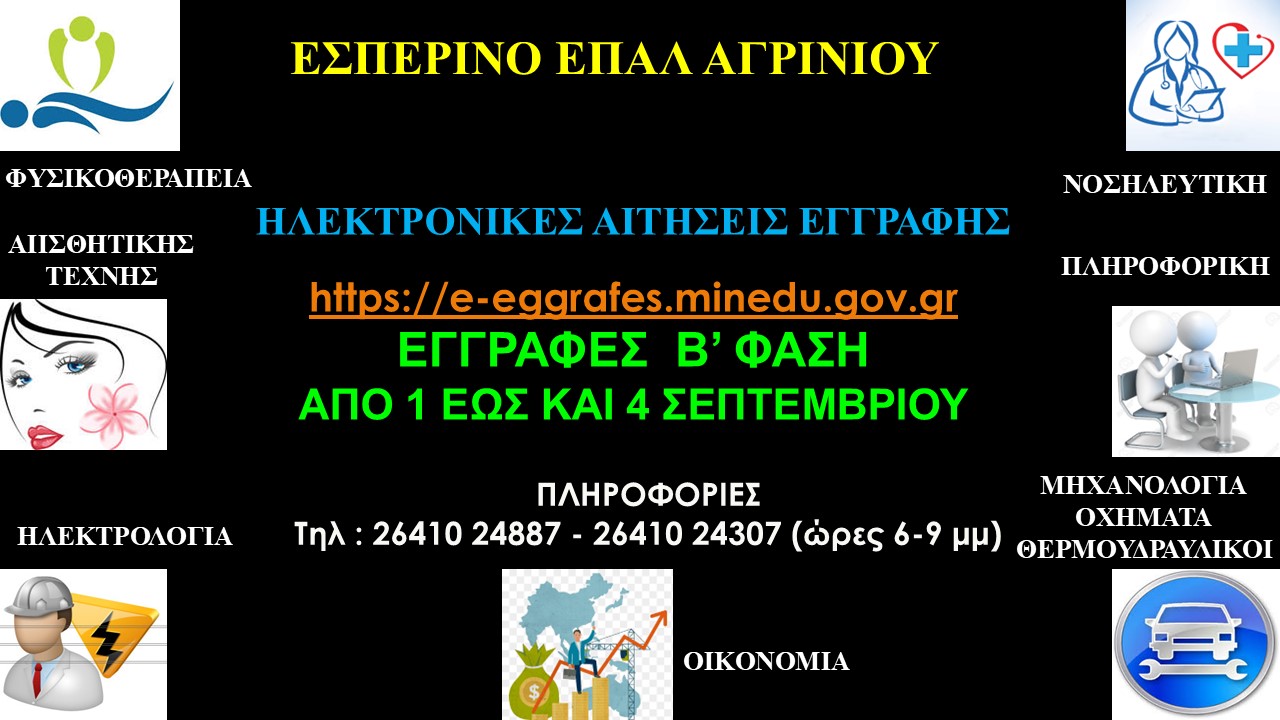 Το Εσπερινό ΕΠΑΛ Αγρινίου θα παραμείνει ανοικτό για την εξυπηρέτηση όσων επιθυμούν να κάνουν την εγγραφή στο σχολείο ή για την κατάθεση των δικαιολογητικών κάθε ημέρα (18:00-21:00) .