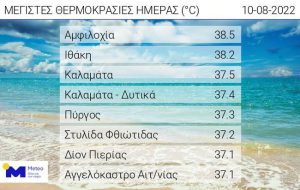 Πολύ υψηλές θερμοκρασίες σημειώθηκαν για μία ακόμη ημέρα στα δυτικά τμήματα της χώρας μας, με την υψηλότερη μέγιστη θερμοκρασία την Τετάρτη 10/08 να καταγράφεται στην Αμφιλοχία με 38,5 °C. Σύμφωνα με το δίκτυο αυτόματων μετεωρολογικών σταθμών του Εθνικού Αστεροσκοπείου Αθηνών / meteo.gr οι οκτώ υψηλότερες μέγιστες θερμοκρασίες κατά τις μεσημεριανές ώρες της Τετάρτης 10/08, παρουσιάζονται στον παρακάτω