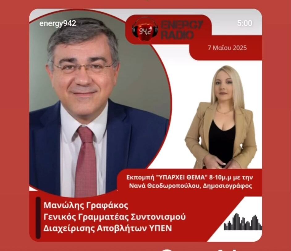 Με αφορμή την υπογραφή της σύμβασης του έργου «Κατασκευή Μονάδας Επεξεργασίας Αποβλήτων και Μονάδας Επεξεργασίας Βιοαποβλήτων εντός του ΧΥΤΑ 2ης Δ.Ε.», σήμερα στο Αγρίνιο ο Μανώλης Γραφάκος, Γενικός Γραμματέας Συντονισμού Διαχείρισης Αποβλήτων του ΥΠΕΝ μίλησε αποκλειστικά στη δημοσιογράφο Νανά Θεοδωροπούλου, στην εκπομπή «Υπάρχει Θέμα» στον Energy news 94.2