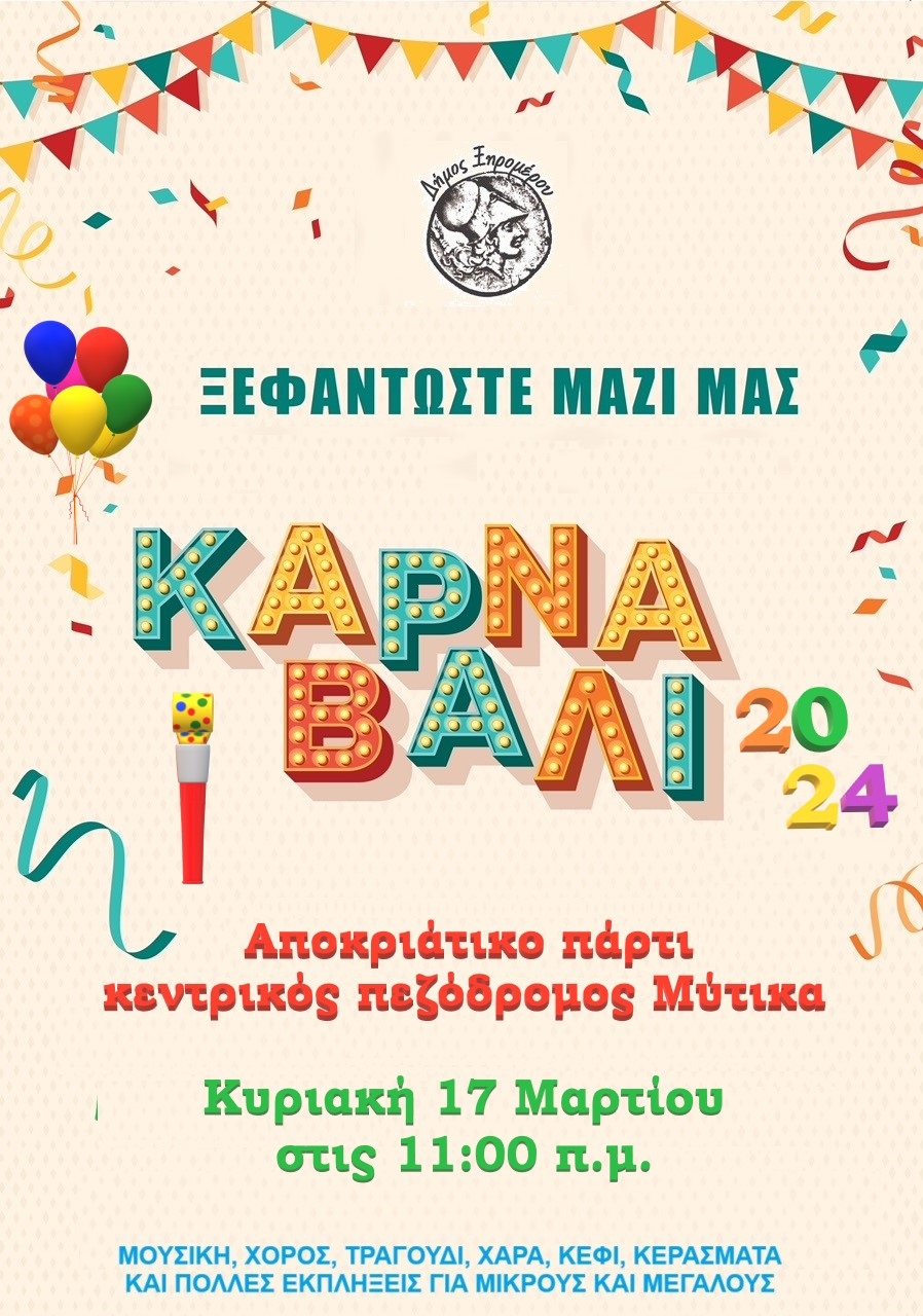 Την Κυριακή 17 Μαρτίου στις 11 το πρωί στον κεντρικό πεζόδρομο του Μύτικα, αποκριάτικο πάρτι με πολλές εκπλήξεις.