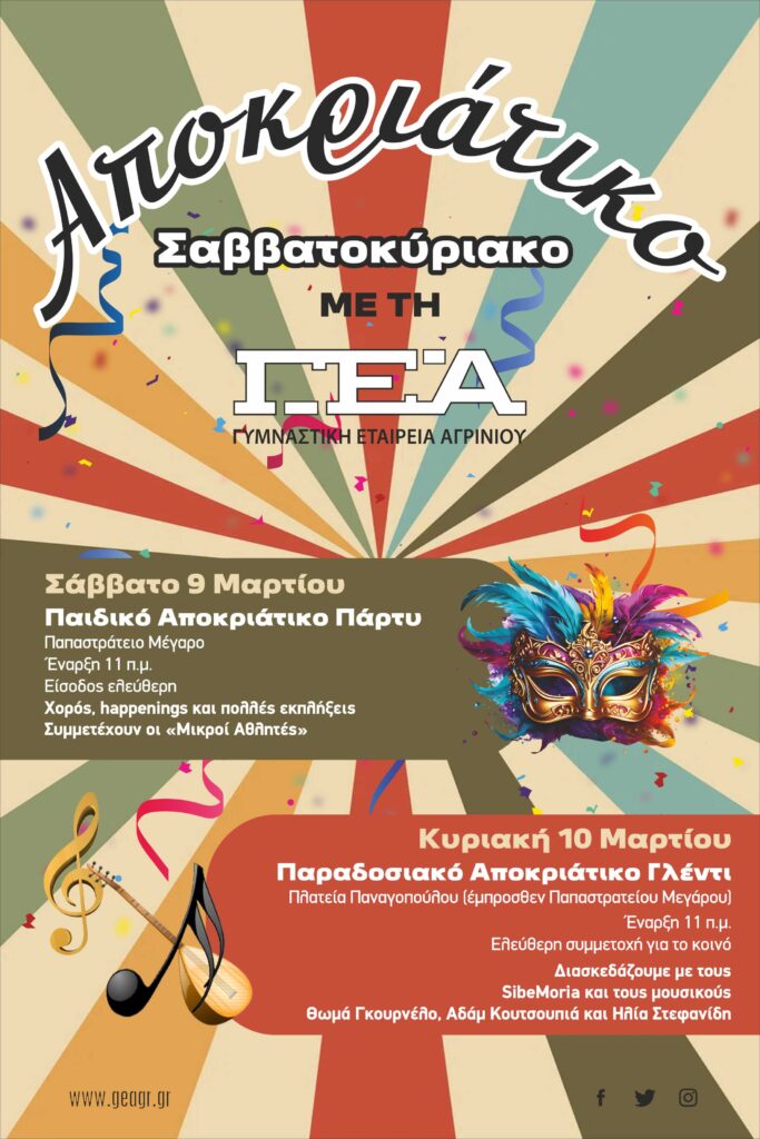 Ένα μοναδικό Αποκριάτικο Σαββατοκύριακο για τους μικρούς και τους μεγάλους φίλους της διοργανώνει η Γυμναστική Εταιρεία Αγρινίου με επίκεντρο το σπίτι της, το Παπαστράτειο Μέγαρο.