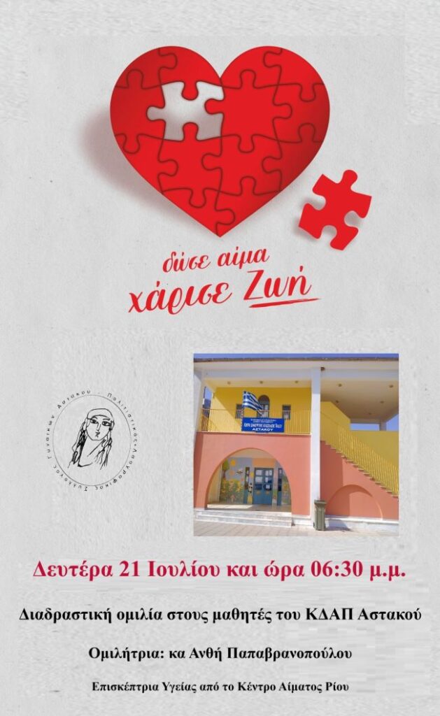 Παράλληλα, στο ΚΔΑΠ Αστακού θα πραγματοποιηθεί βιωματική δράση για τα παιδιά, με στόχο την ενημέρωση και ευαισθητοποίηση γύρω από την αξία και τα οφέλη της εθελοντικής αιμοδοσίας.