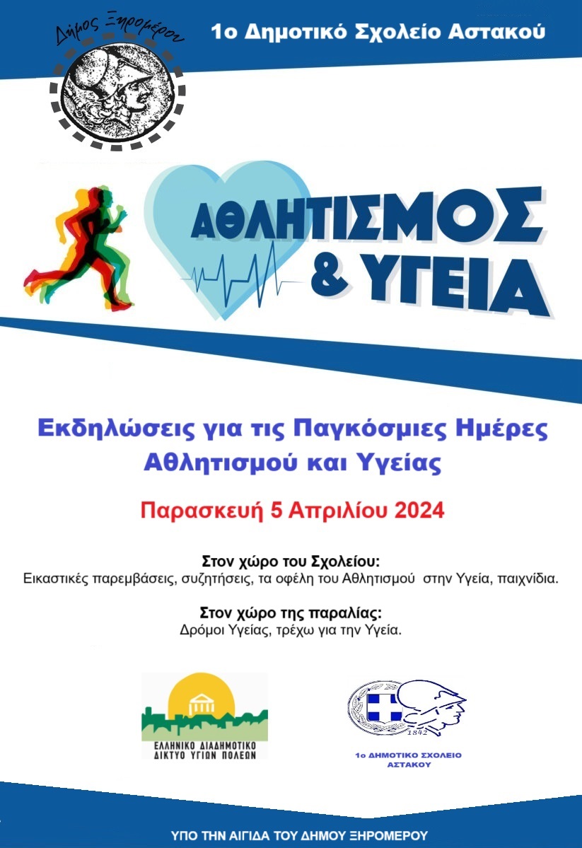 Θέλοντας να τιμήσουμε τις δυο αυτές ημέρες και να μεταδώσουμε τα μήνυμα τους στηρίζουμε μαζί και με το Δίκτυο Υγιών πόλεων ΕΔΔΥΠΠΥ την εκδήλωση που διοργανώνει την Παρασκευή 5 Απριλίου το Δημοτικό Σχολείο Αστακού, με σκοπό την ευαισθητοποίηση των μαθητών, των γονέων και των πολιτών για τα οφέλη του Αθλητισμού στην διατήρηση και την προαγωγή υγείας.