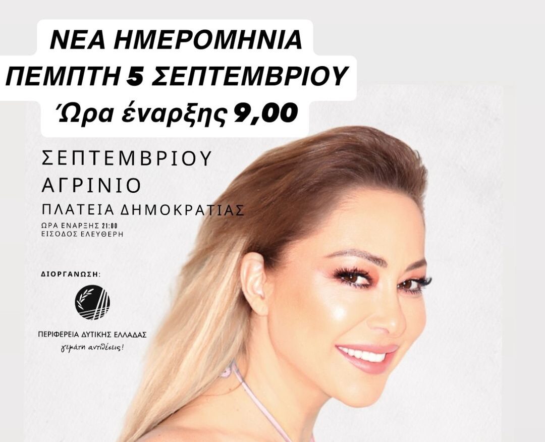 Η προγραμματισμένη για χθες Τρίτη 3 Σεπτεμβρίου, συναυλία της Μελίνας Ασλανίδου στην κεντρική πλατεία του Αγρινίου, αναβλήθηκε εξαιτίας των άσχημων καιρικών συνθηκών που επικρατούσαν στην περιοχή. Η νέα ημερομηνία διεξαγωγής είναι αύριο, Πέμπτη 5 Σεπτεμβρίου 2024 στις 21:00, στη πλατεία Δημοκρατίας.