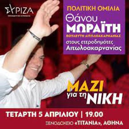 Πολιτική εκδήλωση ενόψει των εθνικών εκλογών της 21ης Μαΐου, θα πραγματοποιήσει ο βουλευτής Αιτωλοακαρνανίας του ΣΥΡΙΖΑ – Προοδευτική Συμμαχία Θάνος Μωραΐτης, για τους Αιτωλοακαρνάνες ετεροδημότες της Αττικής, αύριο Τετάρτη 5 Απριλίου και ώρα 7 το απόγευμα, στο Ξενοδοχείο Τιτάνια, οδός Πανεπιστημίου 52.