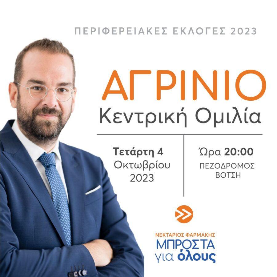 Σημειώνεται πως ο κύκλος της προεκλογικής περιόδου θα κλείσει με ομιλία του Νεκτάριου Φαρμάκη, την Παρασκευή 6 Οκτωβρίου 2023 (ώρα 19:30) στον πεζόδρομο της Αγ. Νικολάου στην Πάτρα.