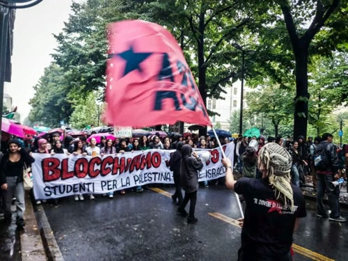Στην Μπολόνια, στην πορεία των εργαζομένων παίρνουν επίσης μέρος φοιτητές και μαθητές, με πανό τα οποία γράφουν «θα μπλοκάρουμε τα πάντα, ελεύθερη Παλαιστίνη».