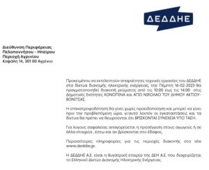 Χωρίς ρεύμα την Πέμπτη Κονοπίνα και Άγιος Νικόλαος Αιτωλ/νίας