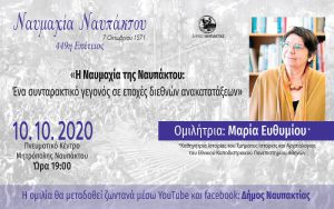 Ταυτόχρονα, έχουμε την τιμή να φιλοξενούμε το Σάββατο, 10 Οκτωβρίου 2020, την Ακαδημαϊκό-Ιστορικό κ.Μαρία Ευθυμίου, η οποία θα πραγματοποιήσει ομιλία με θέμα: «Η Ναυμαχία της Ναυπάκτου: Ένα συνταρακτικό γεγονός σε καιρούς διεθνών ανακατατάξεων».  Η ομιλία θα μεταδοθεί ζωντανά (live streaming) από το Πνευματικό Κέντρο της Μητρόπολης Ναυπάκτου μέσα από τις επίσημες σελίδες YouTube και Facebook: Δήμος Ναυπακτίας. Ώρα έναρξης: 19:00.