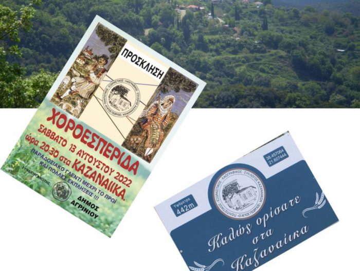 Ο Πολιτιστικός – Εξωραϊστικός – Λαογραφικός Σύλλογος Καζαναίικων «Ο Άγιος Γεώργιος» και ο Δήμος Αγρινίου, διοργανώνουν χοροεσπερίδα το Σάββατο 13 Αυγούστου 2022 και ώρα 20:30 στα Καζαναίικα.