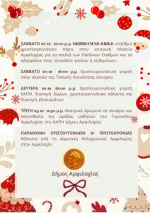 Το εορταστικό πρόγραμμα ξεκινά σήμερα, Πέμπτη 11 Δεκεμβρίου το πρωί με ένα εργαστήρι δημιουργίας στολιδιών στη Δημοτική Βιβλιοθήκη Αμφιλοχίας και ακολουθούν μέχρι την Πρωτοχρονιά εορταστικές δράσεις για τα παιδιά με χρώματα, παιχνίδι και δημιουργικότητα.