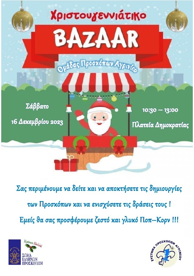 Ταυτόχρονα στο ίδιο χώρο θα πραγματοποιηθεί και το Χριστουγεννιάτικο BAZAAR της Ομάδας Προσκόπων Αγρινίου.