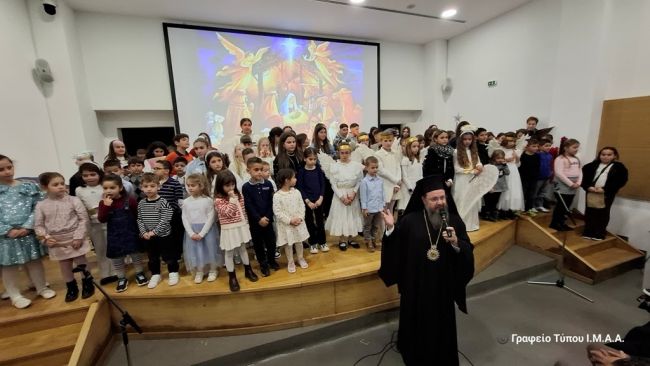 Τα μέλη των Κατηχητικών Σχολείων των Ενοριών της Αρχιερατική Περιφέρειας Βόνιτσας παρουσίασαν επίκαιρο θεατρικό δρώμενο, τραγούδησαν χριστουγεννιάτικα τραγούδια, έψαλλαν παραδοσιακά κάλαντα και απήγγειλαν ποιήματα, αποσπώντας το θερμό χειροκρότημα των συμμετεχόντων, μεταξύ των οποίων ήταν ο Σεβασμιώτατος Μητροπολίτης Αιτωλίας και Ακαρνανίας κ. Δαμασκηνός, ο Δήμαρχος Ακτίου – Βόνιτσας κ. Αθανάσιος Κασόλας, ο Αρχιερατικός Επίτροπος Βόνιτσας, Πρωτοπρ. Χρήστος Βέττας, Κληρικοί της Αρχιερατικής Περιφέρειας, οι Κατηχητές και οι Κατηχήτριες που συνόδευαν τα παιδιά και πολλοί γονείς.