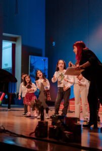Η εκδήλωση άρχισε με το μουσικοπαιδαγωγικό τμήμα του εργαστηρίου, όπου τα παιδιά παρουσίασαν ένα βιωματικό δρώμενο ως αποτέλεσμα της πρώτης τους επαφής με τον ρυθμό, τη μελωδία και το τραγούδι. Ειδικότερα, ζωντάνεψαν επί σκηνής ένα πρωτότυπο παραμύθι, γραμμένο και σκηνοθετημένο από την υπεύθυνη καθηγήτρια κα Λένα Σαββίδου, αναδεικνύοντας την καλλιέργεια του ομαδικού πνεύματος και την ανάπτυξη της δεξιότητας συντονισμού μέσω της μουσικής πράξης.