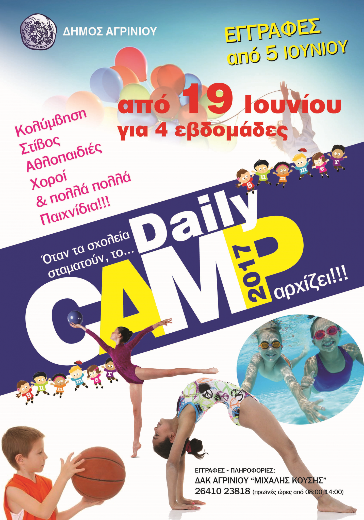 Από τις 19 Ιουνίου και για 4 εβδομάδες διοργανώνεται στο Δημοτικό Αθλητικό Κέντρο Αγρινίου «Μιχάλης Κούσης» το Daily Camp 2017 με προγράμματα κολύμβησης, στίβου, χορού και πολλά παιχνίδια για τα παιδιά ηλικίας 5-12 ετών. Οι εγγραφές ξεκινούν στις 5 Ιουνίου και οι ενδιαφερόμενοι μπορούν να απευθύνονται στο τηλ.  26410 – 23818 (πρωινές ώρες από τις 8.00- 14.00).