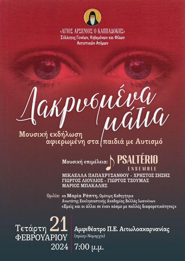 Ο Σύλλογος Γονέων, Κηδεμόνων και Φίλων Αυτιστικών Ατόμων ΑΓΙΟΣ ΑΡΣΕΝΙΟΣ Ο ΚΑΠΠΑΔΟΚΗΣ διοργανώνει μουσική εκδήλωση με τίτλο «Δακρυσμένα Μάτια» αφιερωμένη στα παιδιά με αυτισμό.