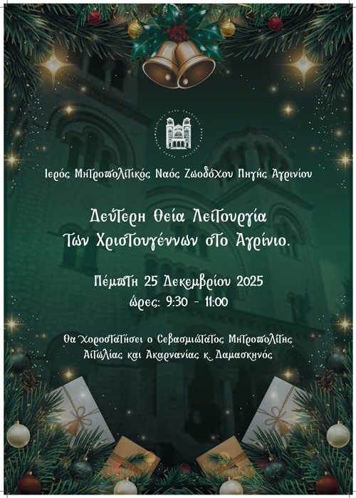 Η Ιερά Μητρόπολη Αιτωλίας και Ακαρνανίας, στο πλαίσιο της ποιμαντικής μέριμνας για τον εκκλησιασμό και την εξυπηρέτηση των λατρευτικών αναγκών των πιστών και ιδιαιτέρως των νέων οικογενειών και των μικρών παιδιών θα τελέσει και εφέτος δεύτερη Θεία Λειτουργία κατά την εορτή των Χριστουγέννων στο Αγρίνιο.