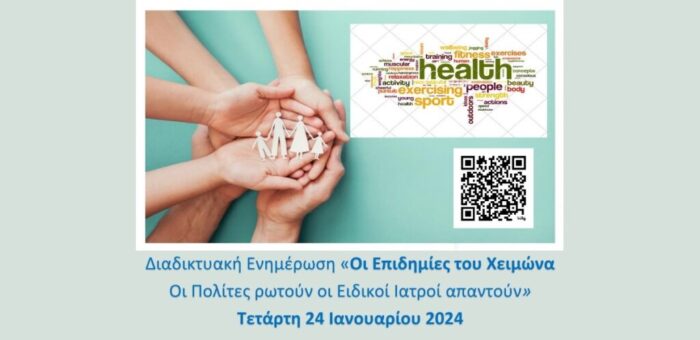 σας προσκαλούμε να συμμετάσχετε, στη διαδικτυακή ενημέρωση του Ελληνικού Διαδημοτικού Δικτύου Υγιών Πόλεων του Π.Ο.Υ. με τίτλο: “Οι Επιδημίες του Χειμώνα, – Οι Πολίτες ρωτούν, οι Ειδικοί Ιατροί απαντούν”, η οποία πραγματοποιείται με τη συνεργασία της Ελληνικής Εταιρείας Χημειοθεραπείας και τον Ιατρικό Σύλλογο Αθηνών.