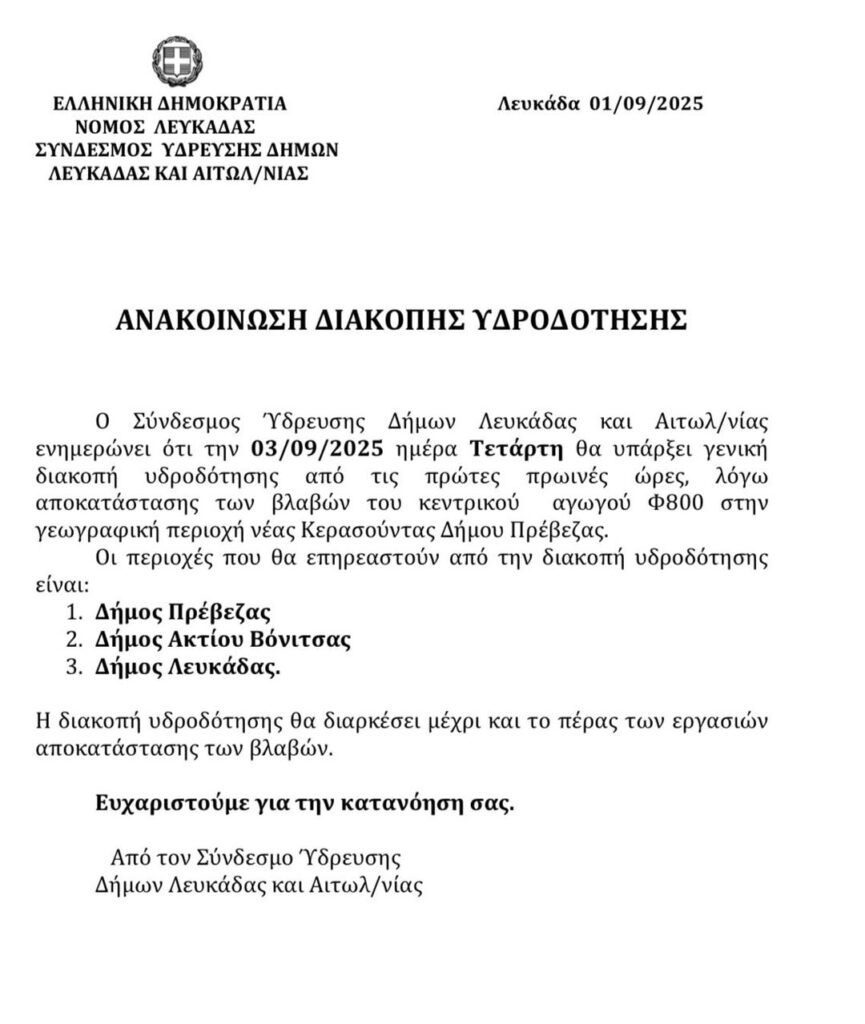 Διακοπή νερού την Τετάρτη σε Βόνιτσα, Λευκάδα και Πρέβεζα