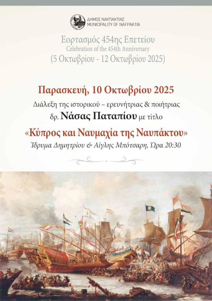Ο Δήμος Ναυπακτίας ενημερώνει ότι, στο πλαίσιο των Εορτασμών της 454ης Επετείου της Ναυμαχίας της Ναυπάκτου η ιστορικός-ερευνήτρια και ποιήτρια Δρ.Νάσα Παταπίου θα πραγματοποιήσει διάλεξη με θέμα «Κύπρος και Ναυμαχία της Ναυπάκτου» την Παρασκευή, 10 Οκτωβρίου 2025 και ώρα 20:30’ στο Ίδρυμα Δημητρίου και Αίγλης Μπότσαρη.