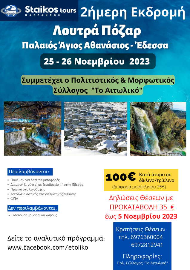 Ο Πολιτιστικός & Μορφωτικός Σύλλογος “Το Αιτωλικό” συμμετέχει στη διήμερη εκδρομή που διοργανώνει το γραφείο “Staikos Tours” στα Λουτρά Πόζαρ – Παλαιός Άγιος Αθανάσιος – Έδεσσα