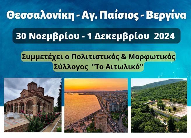 Διήμερη εκδρομή διοργανώνει ο Πολιτιστικός και Μορφωτικός Σύλλογος «Το Αιτωλικό», με προορισμό την πανέμορφη Θεσσαλονίκη, προσκυνηματική επίσκεψη στον τάφο του Αγ. Παίσιου και στο Μουσείο των Βασιλικών Τάφων στην Βεργίνα. Η εκδρομή θα γίνει το διήμερο 30 Νοεμβρίου και 1 Δεκεμβρίου. Τιμή: 105 ευρώ σε δίκλινο/τρίκλινο- (Διαφορά μονόκλινου 42 ευρώ). Η διαμονή θα γίνει σε ξενοδοχείο 4* στο κέντρο της Θεσσαλονίκης (Εγνατία).