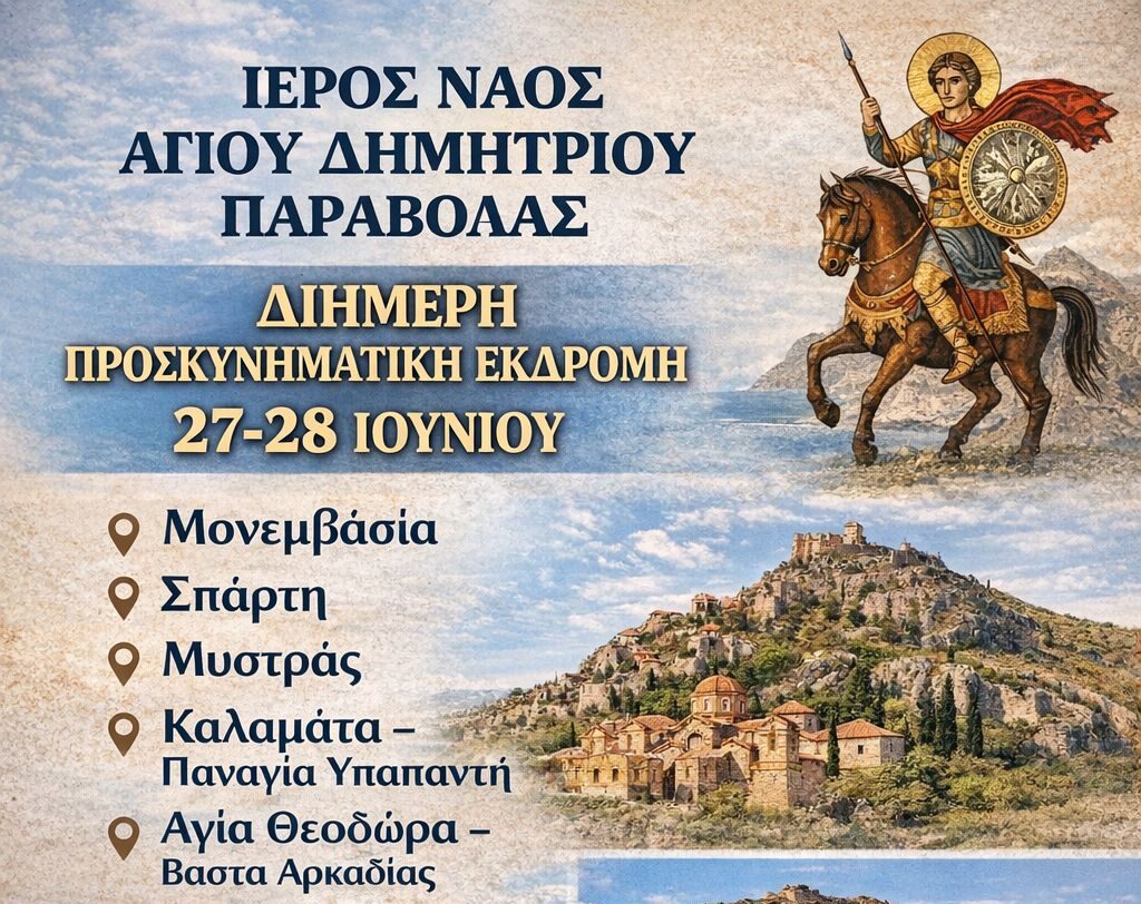 Διήμερη προσκυνηματική εκδρομή διοργανώνει ο Ιερός Ναός Αγίου Δημητρίου Παραβόλας το διήμερο 27 και 28 Ιουνίου 2026 στα Ιερά Προσκυνήματα της Πελοποννήσου